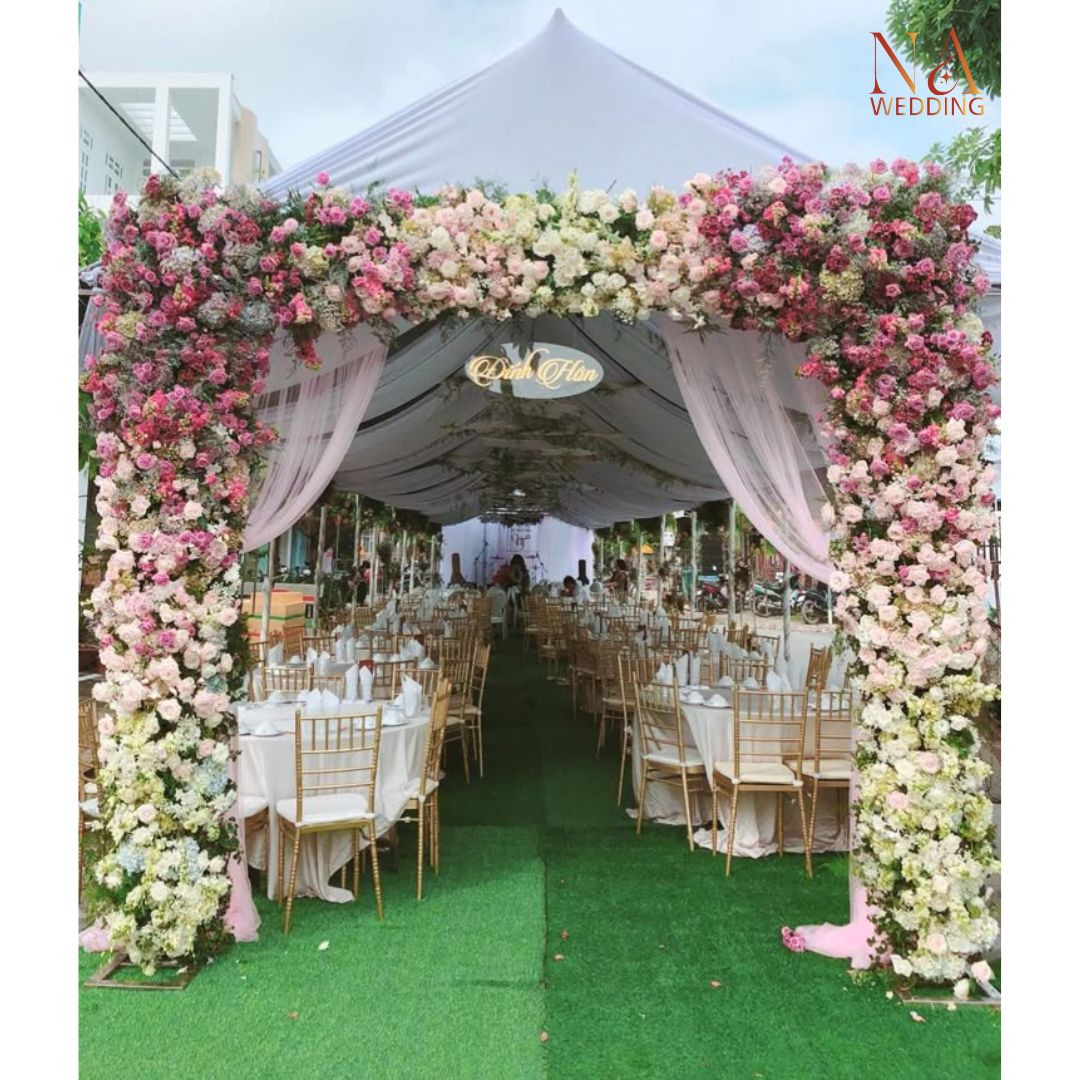 Không gian đón khách dưới mẫu cổng này toát lên sự gần gũi, dễ chịu nhưng không kém phần trang trọng. Đây là lựa chọn lý tưởng cho những buổi lễ ngoài trời, tiệc cưới theo phong cách châu Âu tối giản hoặc các cặp đôi yêu thích sự mộc mạc, tinh khôi và cảm xúc nhẹ nhàng trong ngày cưới.