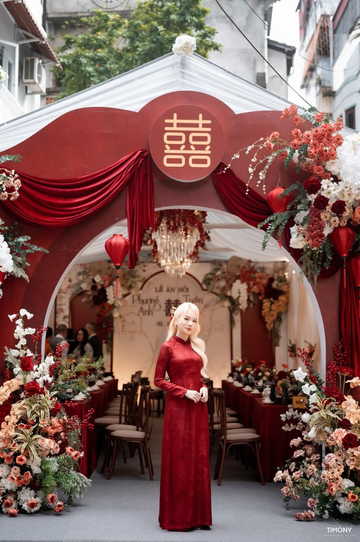 Thiết kế sử dụng hoa lụa cao cấp với sắc đỏ tươi chủ đạo, có thể kết hợp với các loại hoa hồng, mẫu đơn, cẩm tú cầu đỏ hoặc phụ kiện ánh vàng, lá xanh để tạo nên sự cân đối về màu sắc. Phong cách bài trí hướng đến sự rực rỡ nhưng không phô trương, vừa nổi bật lại vừa hài hòa với tổng thể không gian tiệc cưới.