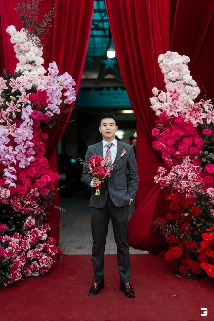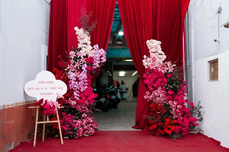 Thiết kế được sắp xếp đơn giản nhưng vẫn chỉn chu, kết hợp hoa lụa đỏ với vài điểm nhấn xanh lá nhẹ nhàng, tạo nên sự cân đối về màu sắc. Tổng thể cổng hoa tuy nổi bật nhưng không gây rối mắt, giữ được nét hài hòa và ấm cúng.