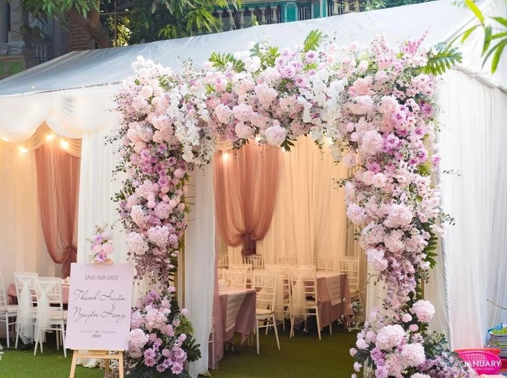 Phù hợp với các buổi lễ tổ chức tại nhà, sân vườn hoặc không gian mở, mẫu cổng này dễ dàng hòa quyện với nhiều phong cách trang trí khác như vintage, cổ tích hay hiện đại tối giản.