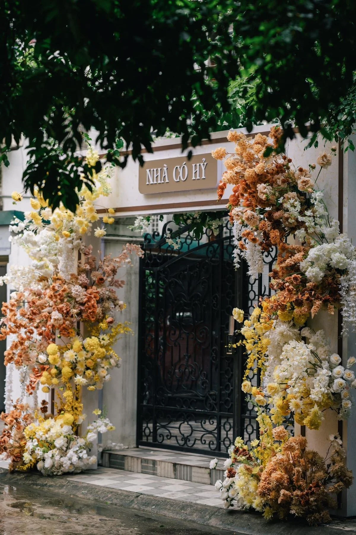 Lấy cảm hứng từ sắc nắng dịu nhẹ, mẫu cổng hoa này kết hợp khéo léo các loài hoa như hoa hồng vàng, cẩm chướng, lan, và mimosa, đan xen cùng sắc trắng kem và xanh lá mát mắt. Toàn bộ phần vòm được thiết kế mềm mại, tạo hiệu ứng chuyển màu tự nhiên từ vàng nhạt đến vàng đậm, như ánh sáng lan tỏa trong không gian lễ cưới.